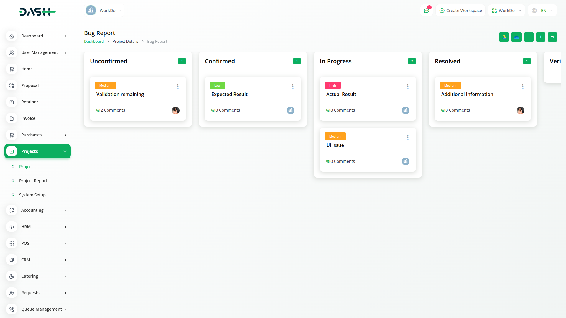 Create new bugs and assign users and priority to them. You can write a note in the text box for the bug description. Also, the status of each bug could be changed through an easy drop-down and Kanban drag system.